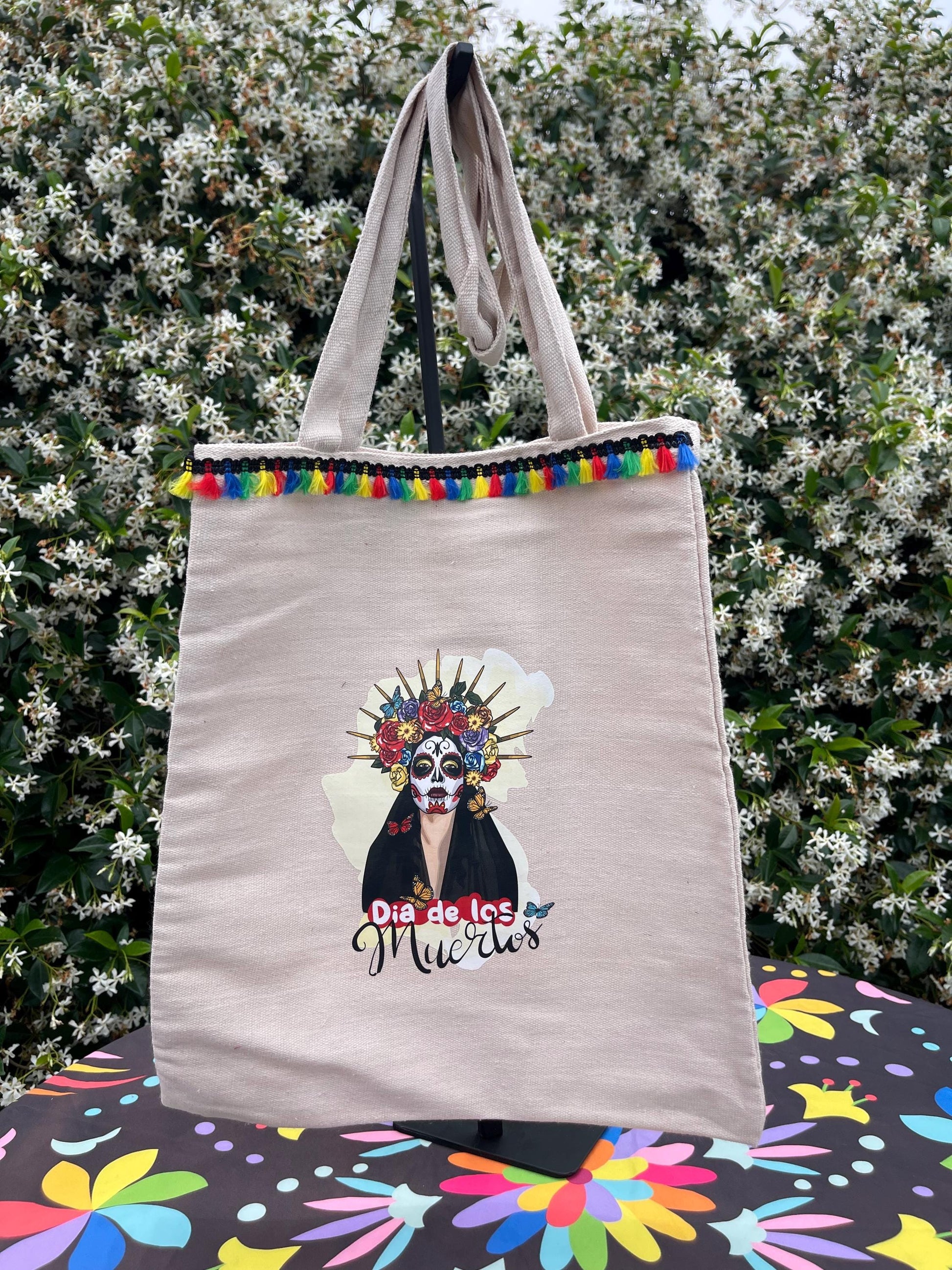 Add a pop of culture and color to your everyday style with this handcrafted Mexican canvas tote bag! Made with durable canvas, this bag features vibrant iron-on artwork and is finished with a decorative trim inspired by traditional Mexican designs.